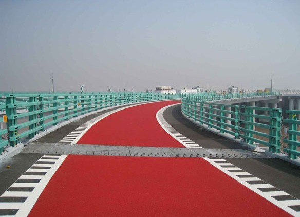 地面牢固整合。3、抗压层施工:底涂干燥后整体批刮黄色止滑抗压中层;待不粘脚后按设计划线并粘贴美纹纸。4、防滑层施工:整体喷涂绿色或其他颜色防滑面层。5、保护层施工防滑层初凝时揭去美纹纸,防滑层干燥时滚涂或喷涂专用罩光剂养护车道。